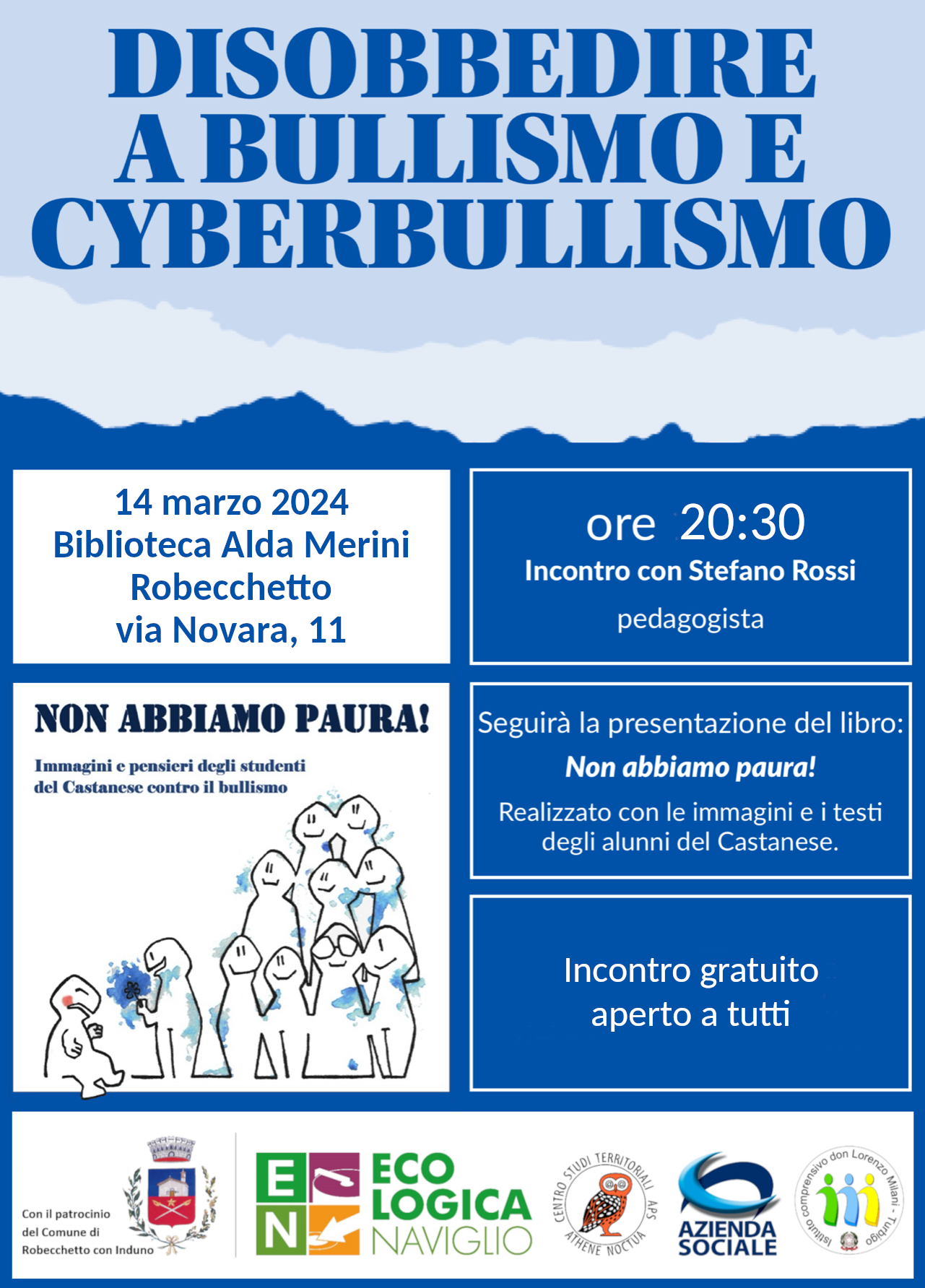 Il 14 marzo, alle 20.30, abbiamo organizzato in collaborazione con Azienda Sociale e con il Centro studi territoriali Athene Noctua una serata di presentazione del volume presso la biblioteca Alda Merini di Robecchetto. Durante l’evento, che ha ricevuto il patrocinio del Comune di Robecchetto con Induno, avremo l’onore di avere con noi il pedagogista Stefano Rossi, che aprirà la serata con un intervento dedicato alla delicata tematica del bullismo.