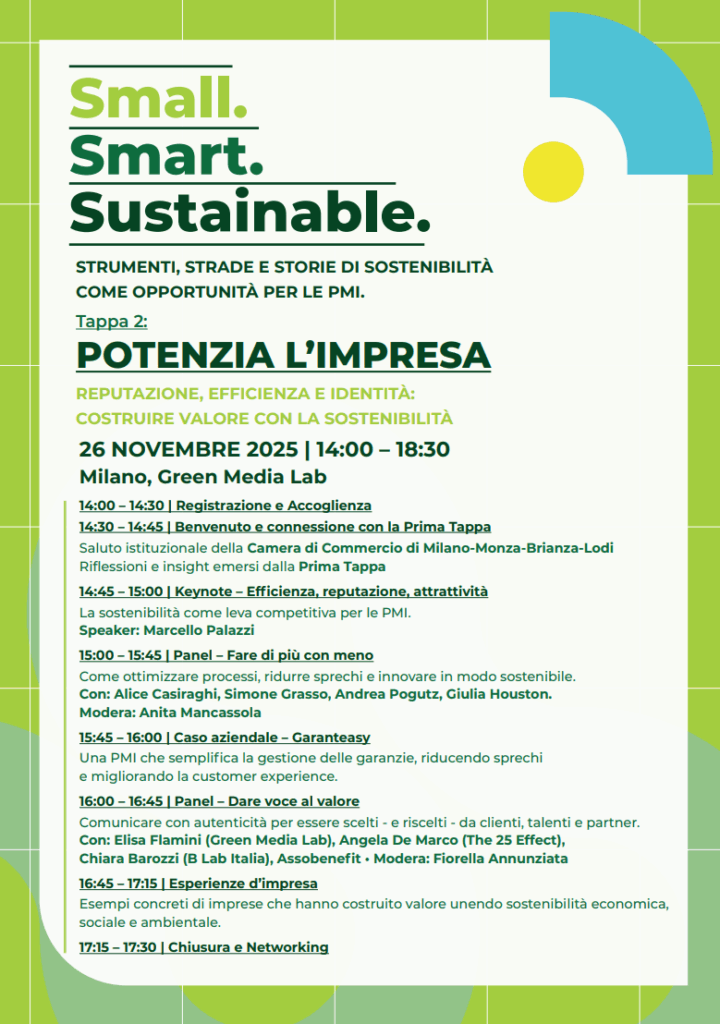 Il secondo dei due eventi “Small. Smart. Sustainable.” organizzati da Formaper e rivolti alle imprese che vogliono trasformare la sostenibilità in vantaggio competitivo, si terrà mercoledì 26 novembre 2025.