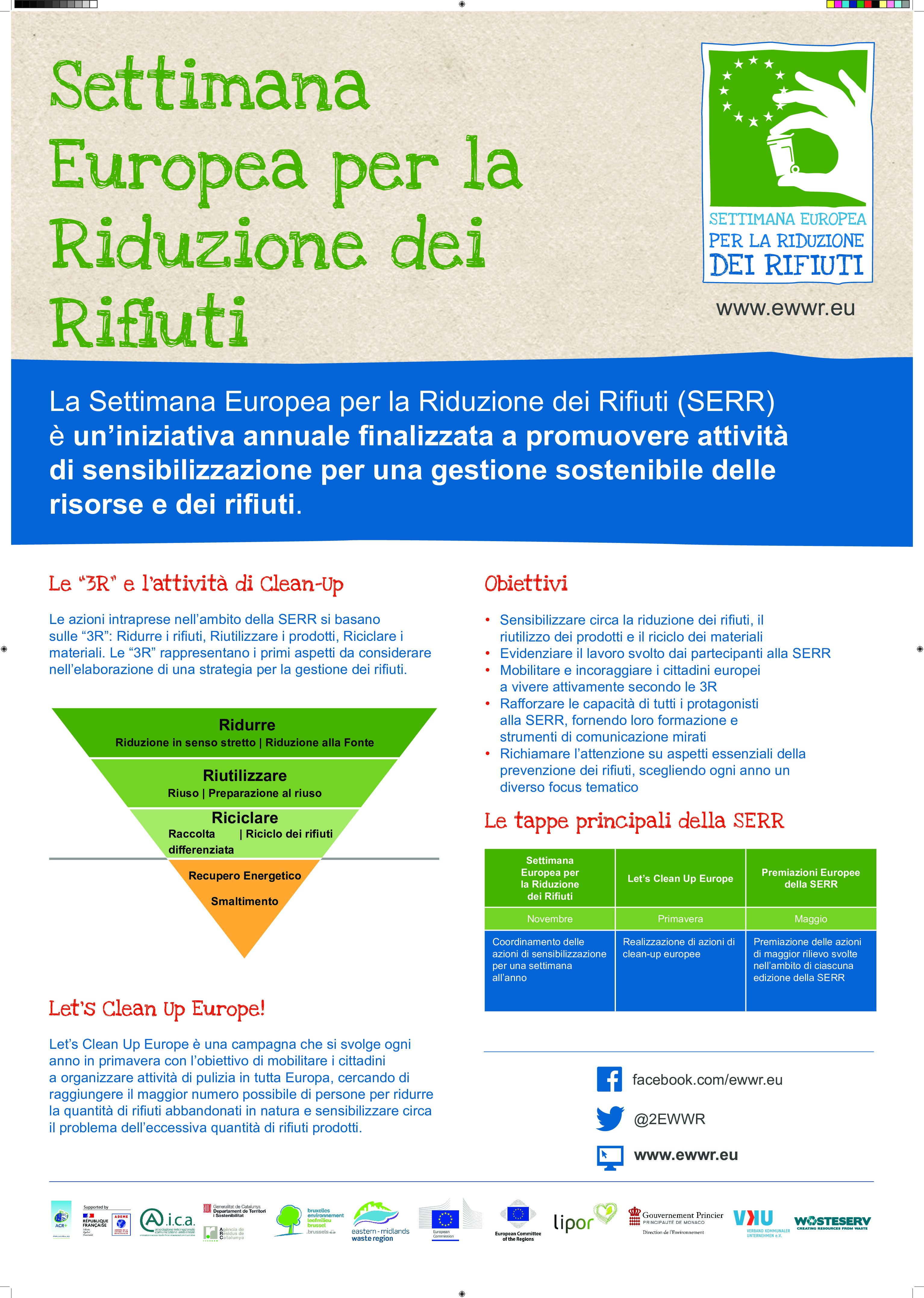 La Settimana Europea per la Riduzione dei Rifiuti nasce all’interno del Programma LIFE+ della Commissione Europea con l’obiettivo primario di sensibilizzare le istituzioni, i consumatori e tutti gli altri portatori di interessi circa le strategie e le politiche di prevenzione dei rifiuti messe in atto dall’Unione Europea, che gli Stati membri devono perseguire, anche alla luce delle recenti disposizioni normative (direttiva quadro sui rifiuti, 2008/98/CE).