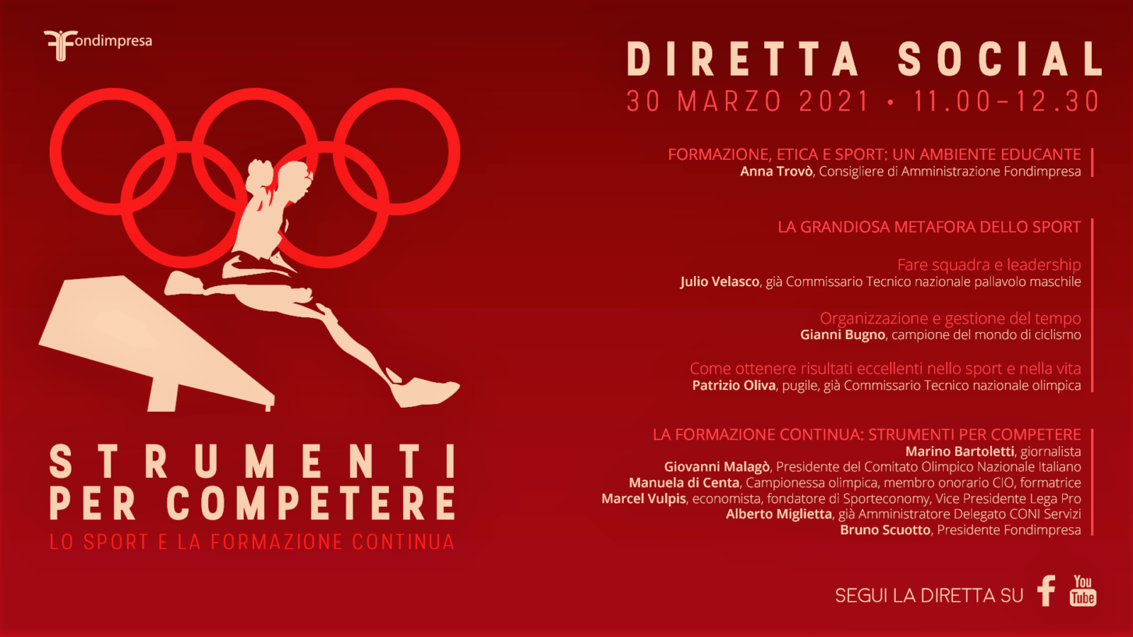 Se come noi desideri scoprire i migliori strumenti per competere, nello sport così come nel lavoro, ti aspettiamo martedì 30 marzo, dalle 11.00 alle 12.30, sulla pagina Facebook e sul canale Youtube di Fondimpresa. Non mancare!