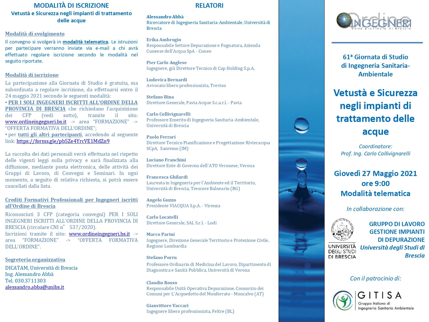 Il 27 maggio dalle ore 9.00 alle ore 13.00 si terrà online la 61^ Giornata di Studio a cura del Gruppo di lavoro Gestione Impianti di Depurazione dell’Università di Brescia.